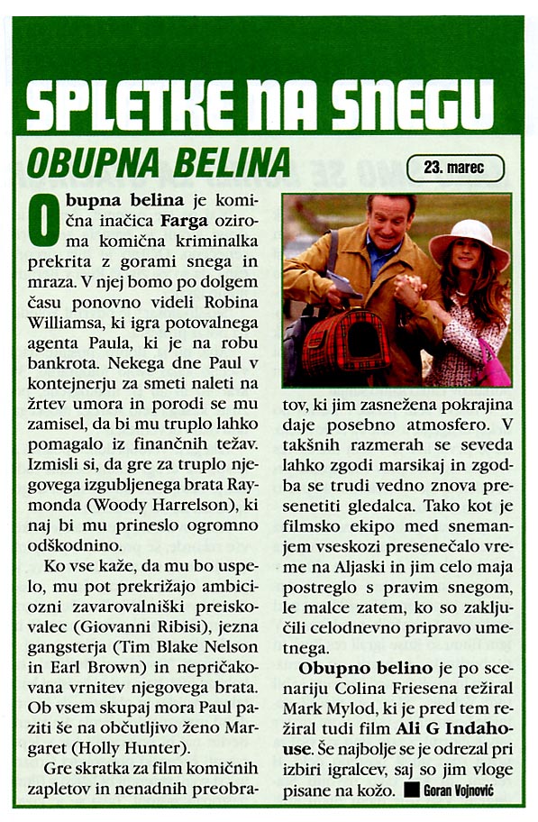 Potovalni agent Paul Barnell (Robin Williams) in njegova žena Margaret (Holly Hunter) preživljata težke čase, saj sta na robu bankrota. Paul naleti na žrtev umora in porodi se mu zamisel, da bi mu truplo lahko pomagalo iz finančnih težav. Izmisli si, da gre za truplo njegovega izgubljenega brata Raymonda (Woody Harrelson). To naj bi mu prineslo ogromno odškodnino. Mu bo z zamrznjenim truplom, pogrešanim bratom in zavarovalno polico uspelo odgnati denarne skrbi in obdržati svojo ženo pri pameti? Vse kaže na to, toda načrte mu prekrižajo ambiciozni zavarovalniški preiskovalec (Giovanni Ribisi), jezna gangsterja (Tim Blake Nelson in Earl Brown) in nepričakovana vrnitev njegovega brata. Komično kriminalko je po scenariju Colina Friesena režiral Mark Mylod. Producenti so Christopher Eberts, Chris Roberts in John Schimmel.