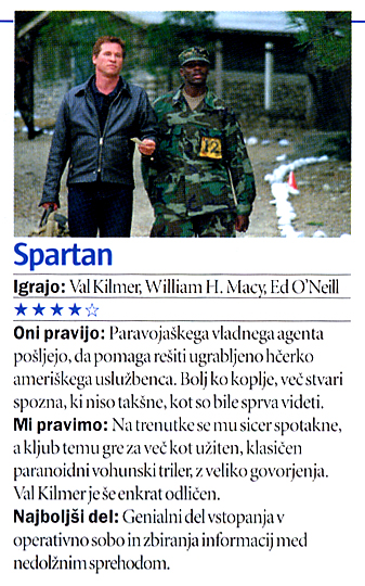Creativa Cinemania Group, Warner Bros in Franchise Pictures predstavljajo politični triler Špartanec, scenarista in režiserja DAVIDA MAMETA. Igralsko zasedbo sestavljajo VAL KILMER, DEREK LUKE, ED O'NEILL in WILLIAM H. MACY.