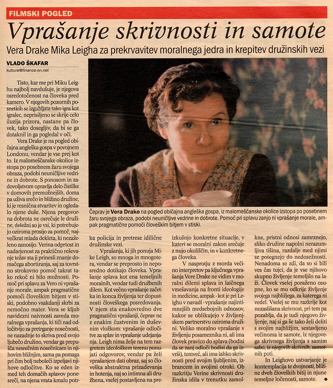 Ne bom pojasnjeval filma VERA DRAKE. Moralne dileme, ki jih obravnava, niso preproste, in vsak izmed nas se mora spoprijeti s temi vprašanji.