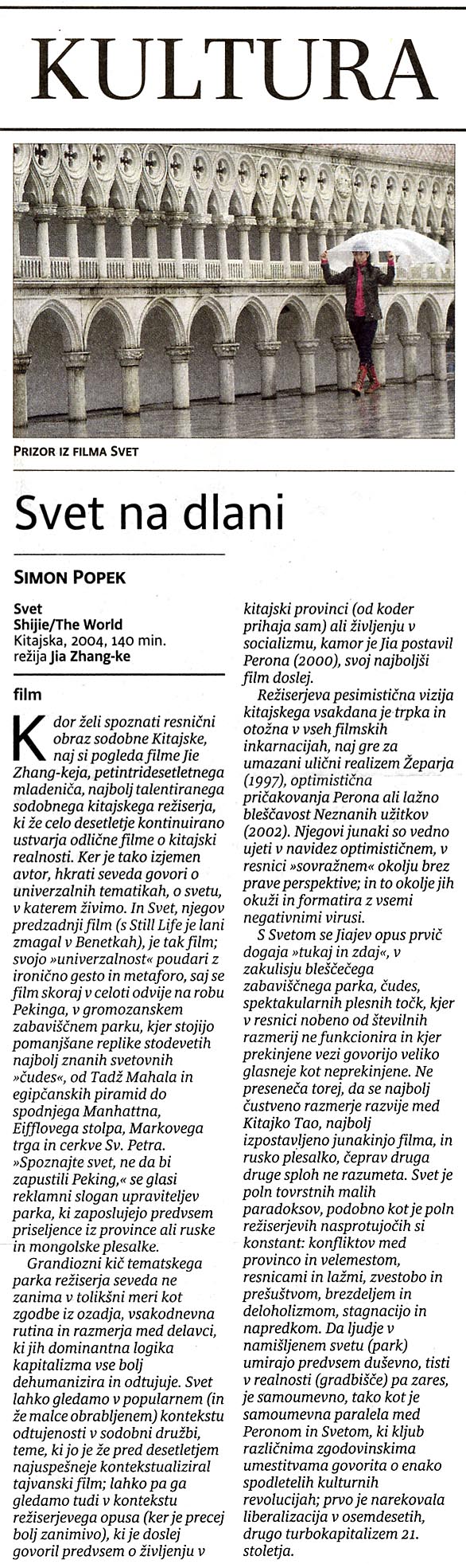 Kitajski režiser Jia Zhangke se je po ukvarjanju z urbanizacijo na severnem Kitajskem v treh filmih UNKNOWN PLEASURES, PLATFORM and XIAO WU (PICKPOCKET) obrnil k velikemu mestu ter s filmom SVET obravnaval življenje v njem ter posledice urbanizacije in modernizacije na Kitajskem.