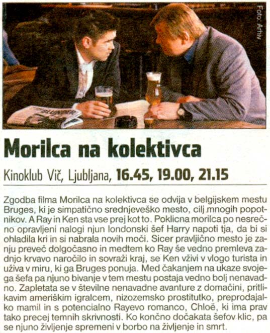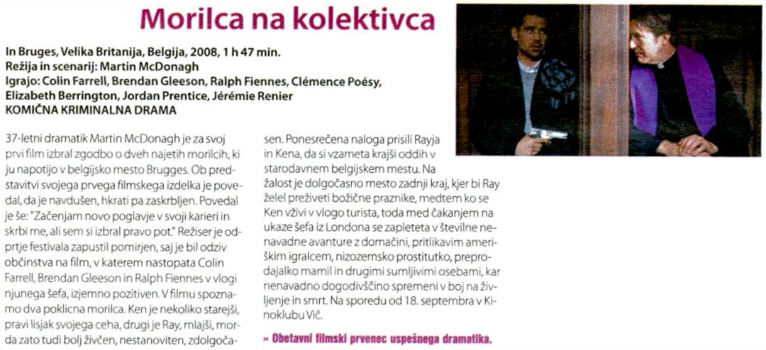 Mesto Bruges, dobro ohranjeno srednjeveško mesto v Belgiji, je odlična destinacija za popotnike iz vsega sveta. Toda za poklicna morilca Raya (Colin Farrell) in Kena (Brendan Gleeson) je vse prej kot to. Vse namreč kaže, da je lahko to njuna zadnja destinacija. Zaradi težke naloge, ki sta jo komaj opravila, ju njun londonski šef Harry (Ralph Fiennes) napoti v pravljično mesto, da si ohladita kri in dodobra odpočijeta.