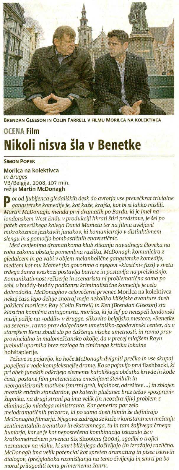 Ujeta med gotsko arhitekturo, kanali in tlakovanimi ulicami si poskušata poklicna morilca zapolniti dneve v vlogi turistov. Ray, ki še vedno premleva zadnjo krvavo naročilo, sovraži kraj, medtem ko Ken uživa v miru, ki ga ponuja lepo in čisto mesto.