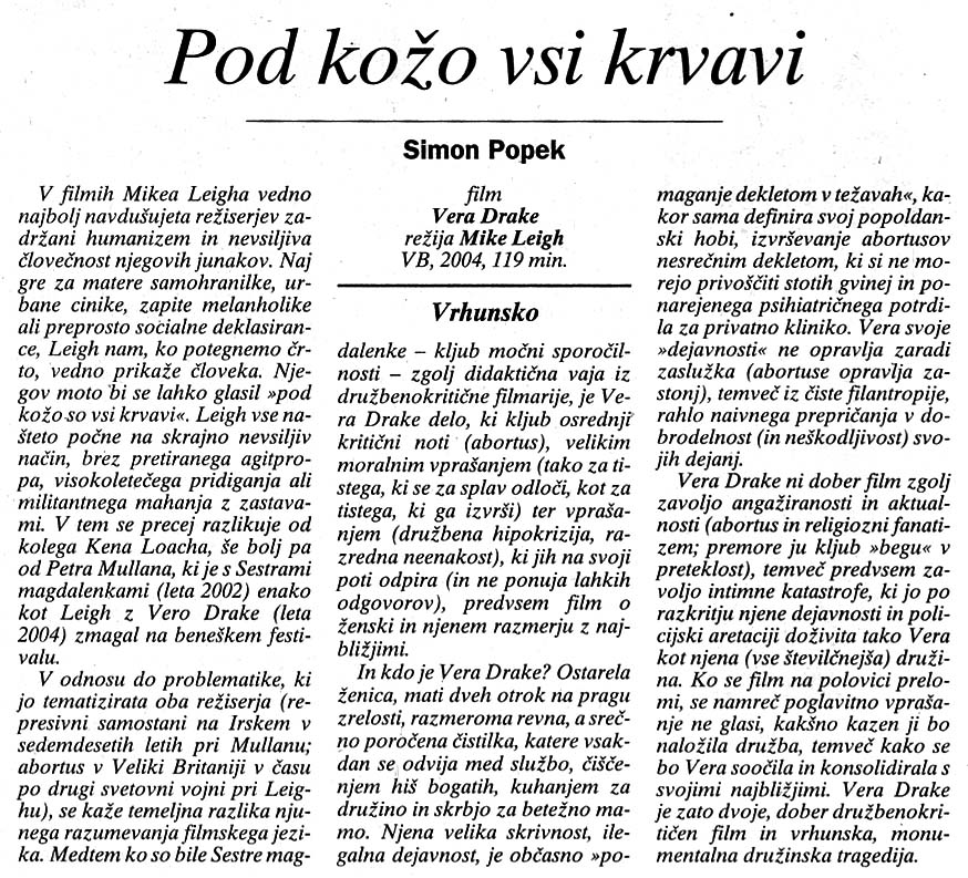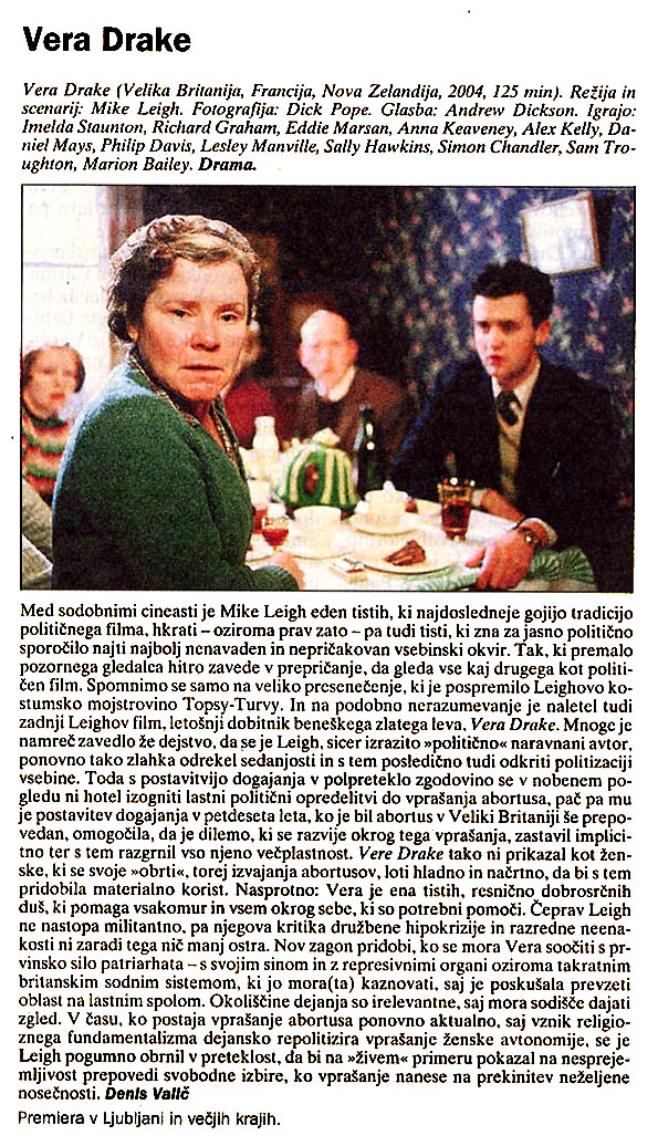 Ne bom pojasnjeval filma VERA DRAKE. Moralne dileme, ki jih obravnava, niso preproste, in vsak izmed nas se mora spoprijeti s temi vprašanji.