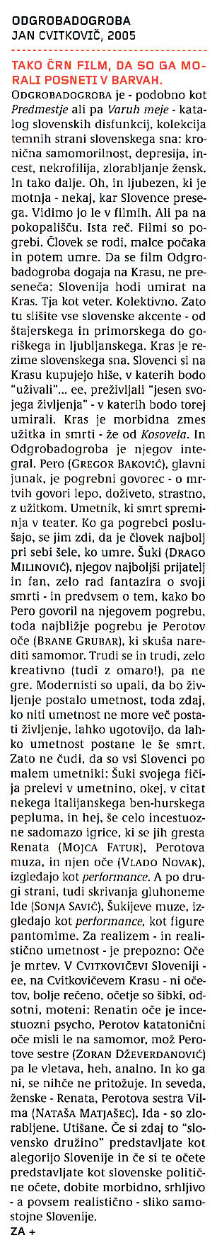 V takšni ekstremno nedolžni zgodbi film Odgrobadogroba akomulira silo in temni nameni izbruhnejo po vsakem trenutku sreče in obratno. Režiser Jan Cvitkovič se poigrava z vprašanji nebes in pekla, življenja in smrti. Karakterji živijo na meji med dvema svetovoma in vedno ne končajo na strani, kjer bi želeli biti.
