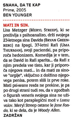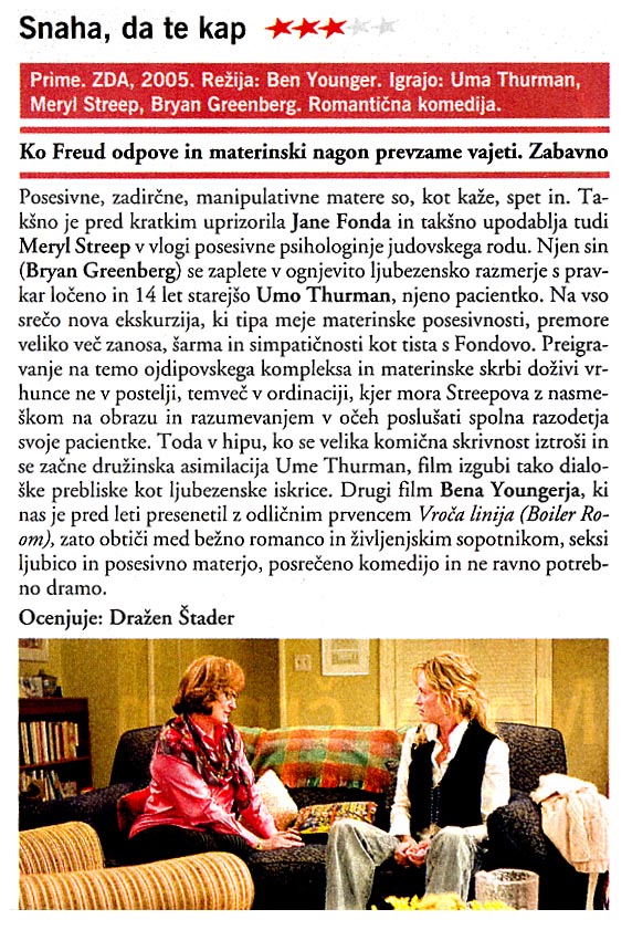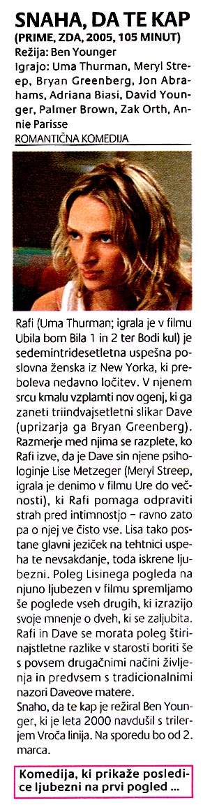 Duhovita romantična komedija Bena Youngerja je zgodba o nenavadnem ljubezenskem razmerju v osrčju živahnega Manhattana. Rafi (UMA THURMAN), 37-letna fotografinja, ki ima za seboj bolečo ločitev, spozna Davida (BRYAN GREENBERG), 23-letnega slikarja s pravkar zaključenim študijem. Ljubezen na prvi pogled se sprevrže v resno zvezo z vsakodnevnimi težavami, ki jih razlika v letih le še poglablja. Lisa (MERYL STREEP) je psihologinja, ki Rafi pomaga pri njenih težavah v spolnosti. Žal pa je Rafin nov fant prav Lisin edinček David. Sprva je vse popolno, Rafi in David sta našla tisto, po čemer sta hrepenela. David si je želel resnega razmerja. S pomočjo Rafi vstopi v svet odraslih, izziv mu je všeč. Rafi je iskala zdravilo. Po težki ločitvi je mladenič z neizmernim zagonom in svežino zadetek v polno. Toda par se spopada s 14-letno starostno razliko, poleg tega prihaja iz povsem različnih okolij. David še vedno živi pri svojih starih starših, Rafi je samostojna intelektualka. Pika na i je Davidova tradicionalna mama. Film na iskren in zabaven način prikazuje srečo in neizogibne težave v razmerju do ušeh zaljubljenih ljubimcev