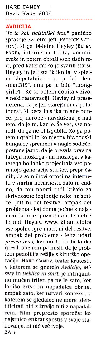 Zamisel za film sem dobil v članku o mladih dekletih na Japonskem, ki so se podajala v razmerja s starejšimi moškimi, ki so jih spoznala prek interneta. Zvabila so jih k sebi, tam pa jih je pričakalo več prijateljev, ki so izbrance pretepli in mučili. Pomislil sem na zgodbo, kjer bi to počela samo ena punca. Punca, ki zapeljuje moške, ki nadlegujejo druge punce. Za scenarista sem takoj izbral Briana. Če zapreš dve osebi v isti prostor za 90 minut, potrebuješ odličnega pisca, sposobnega razviti like in ne zgolj zgodbe. Zgodba se mi zdi predvsem Hayleyjina. Gre za 14-letnega Hannibala Lecterja. Vseskozi se mi je zdela bolj zanimiva od Jeffa, saj njene različice na filmskih platnih še nisem zasledil. Jeff mi je prav tako všeč, a podobne like sem že videval. Ko mi je Brian predložil končno različico scenarija, sem osupel. Vedel sem, kakšen naj bi bil lik Hayley, a nisem pričakoval, da bo izražen tako intenzivno.
