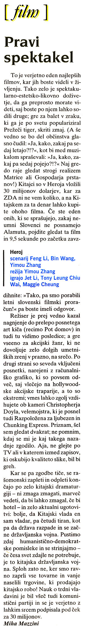 Pri ustvarjanju zgodbe od ljubezni, zvestobi, ljubosumju in prevari so zbrali najbolj slavne azijske talente. Mednarodni zvezdnik borilnih veščin Jet Li je igral Namelessa, skrivnostnega šerifa, ki si zasluži obisk pri kralju Qina. Zvezdnika iz Hong Konga, Tony Leung Chiu Wai in Maggie Cheung Man Yuk, ki je pravkar blestela v filmu In the Mood for Love režiserja Wonga Kara Waija, spet igrata skupaj atentatorja Broken Sworda (Leung) in Flying Snowa (Cheung). Zhang Ziyi, ki nenehno napreduje od debija v priznanem The Road Home, igra zvesto služkinjo Moon, medtem pa veteran Chen Daoming igra mogočnega kralja Qina. Vzhajajoča zvezda in mojster borilnih veščin igra tretjega atentatorja, Skyja.