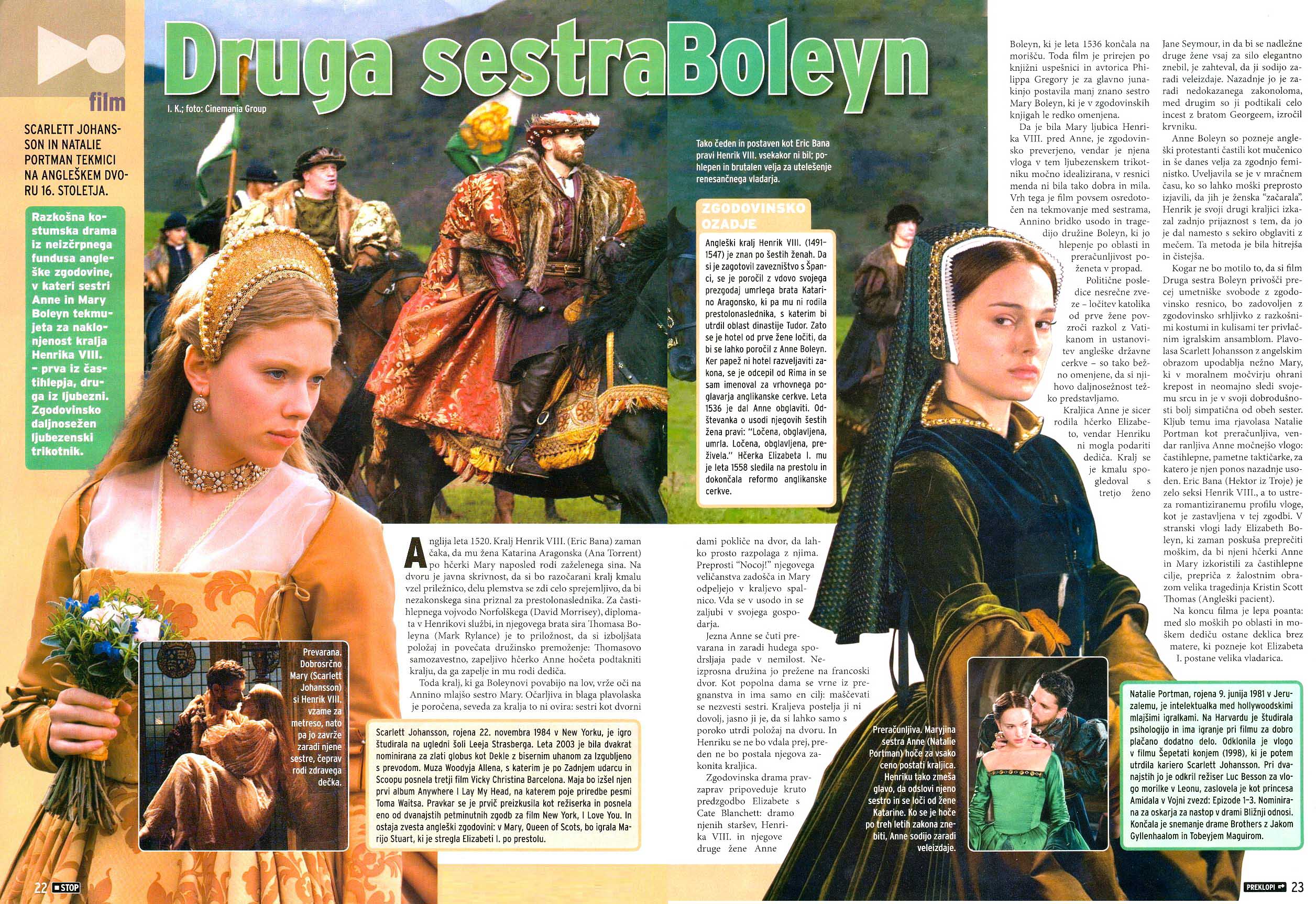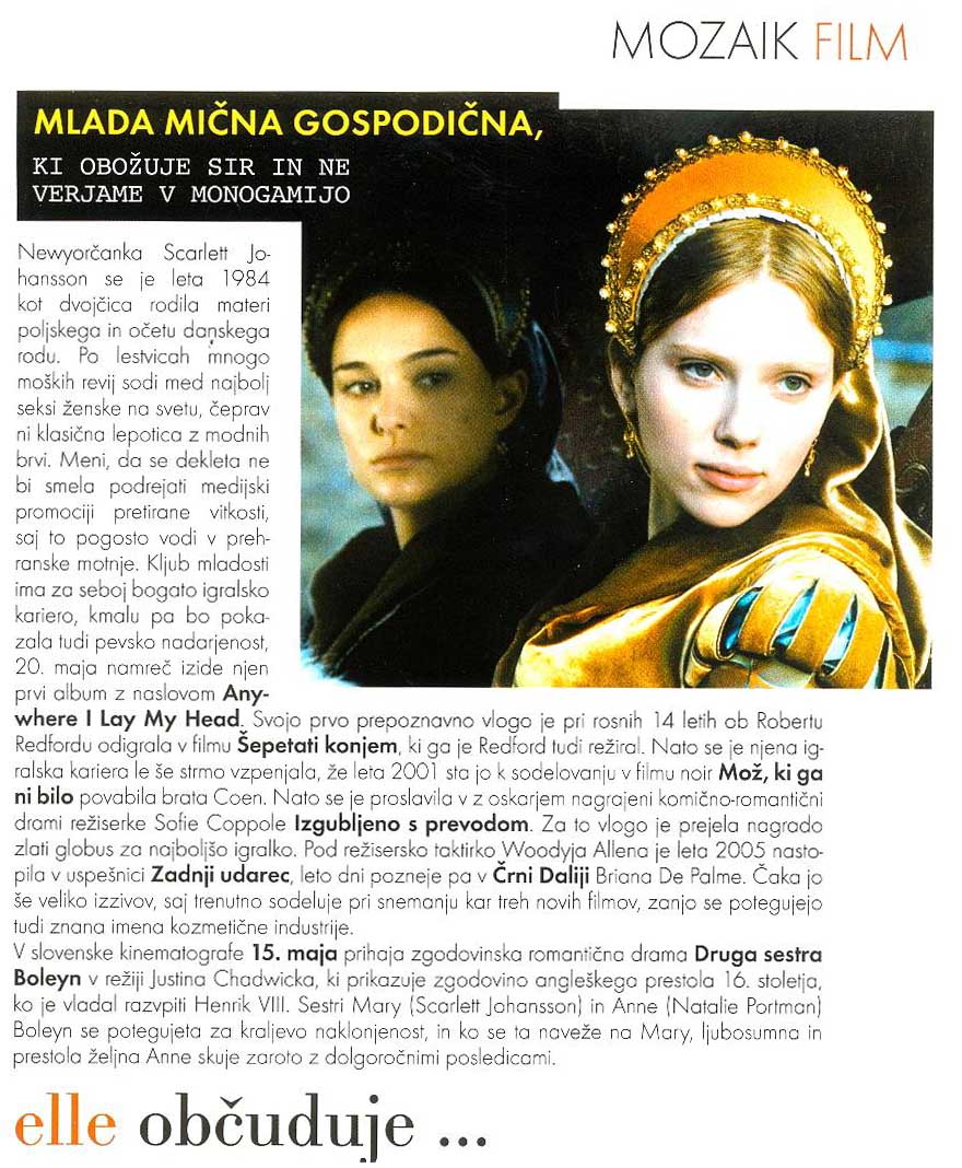 V svoji desetletni igralski karieri je štirikratna nominiranka za zlati globus in dobitnica nagrade BAFTA SCARLETT JOHANSSON (Mary Boleyn) večkrat dokazala, da sodi med najbolj nadarjene mlade igralke Hollywooda. Z vlogo v drami Lost in Translation Sofie Coppole je navdušila tako kritike kot občinstvo in prejela nagrado najboljše igralke na mednarodnem beneškem filmskem festivalu, nagrado BAFTA ter nominacijo za zlati globus. Žirijo, ki podeljuje nominacije za zlati globus, je prepričala tudi z vlogami v uspešnicah Girl With a Pearl Earring, A Love Song for Bobby Long in Match Point.